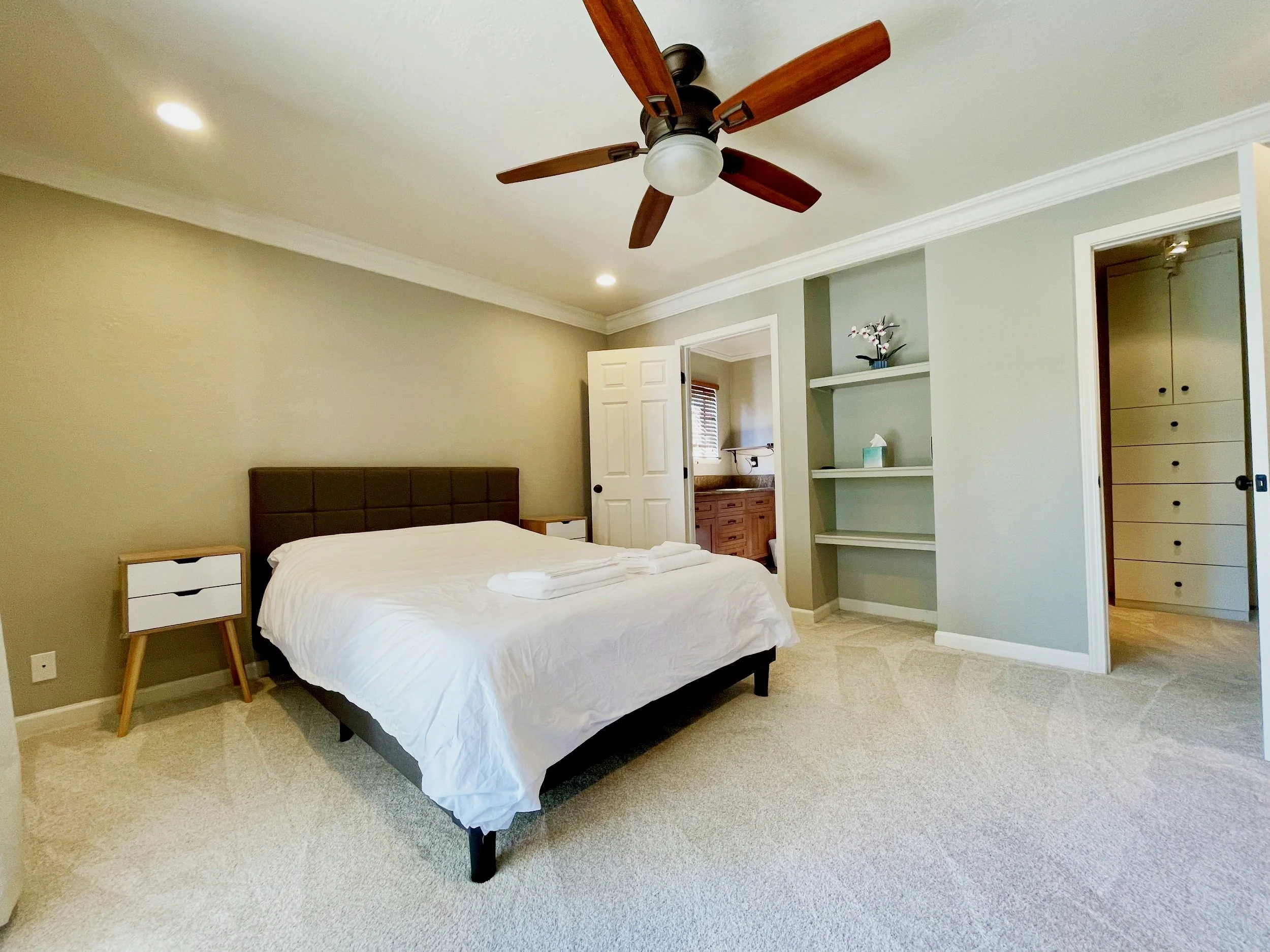 Amenities include, ensuite bathroom, overhead fan. walk-in closet, infant crib, baby bath.